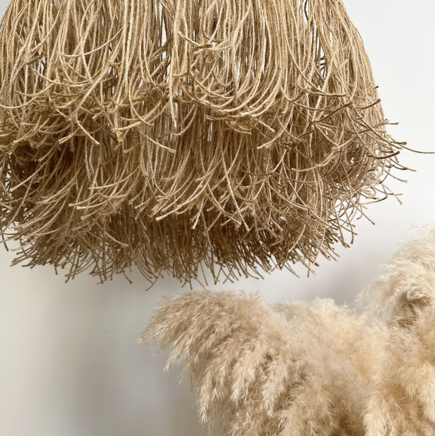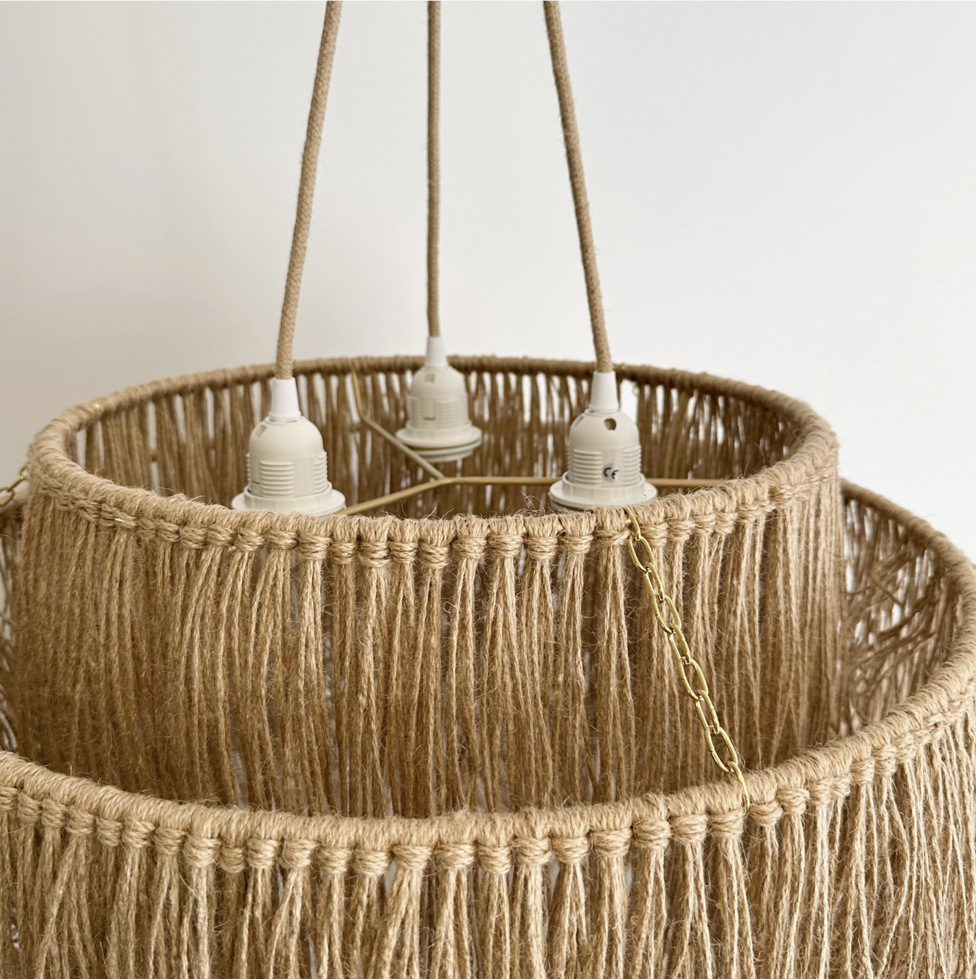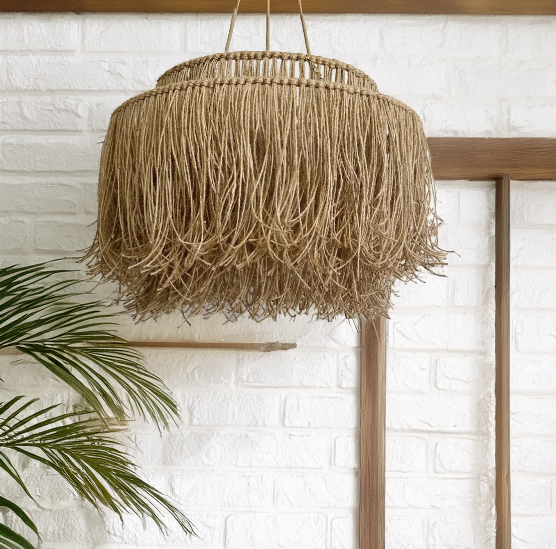 Boho-verlichting. Jute kroonluchter met franjes voor een interieur geïnspireerd op boho-stijl.