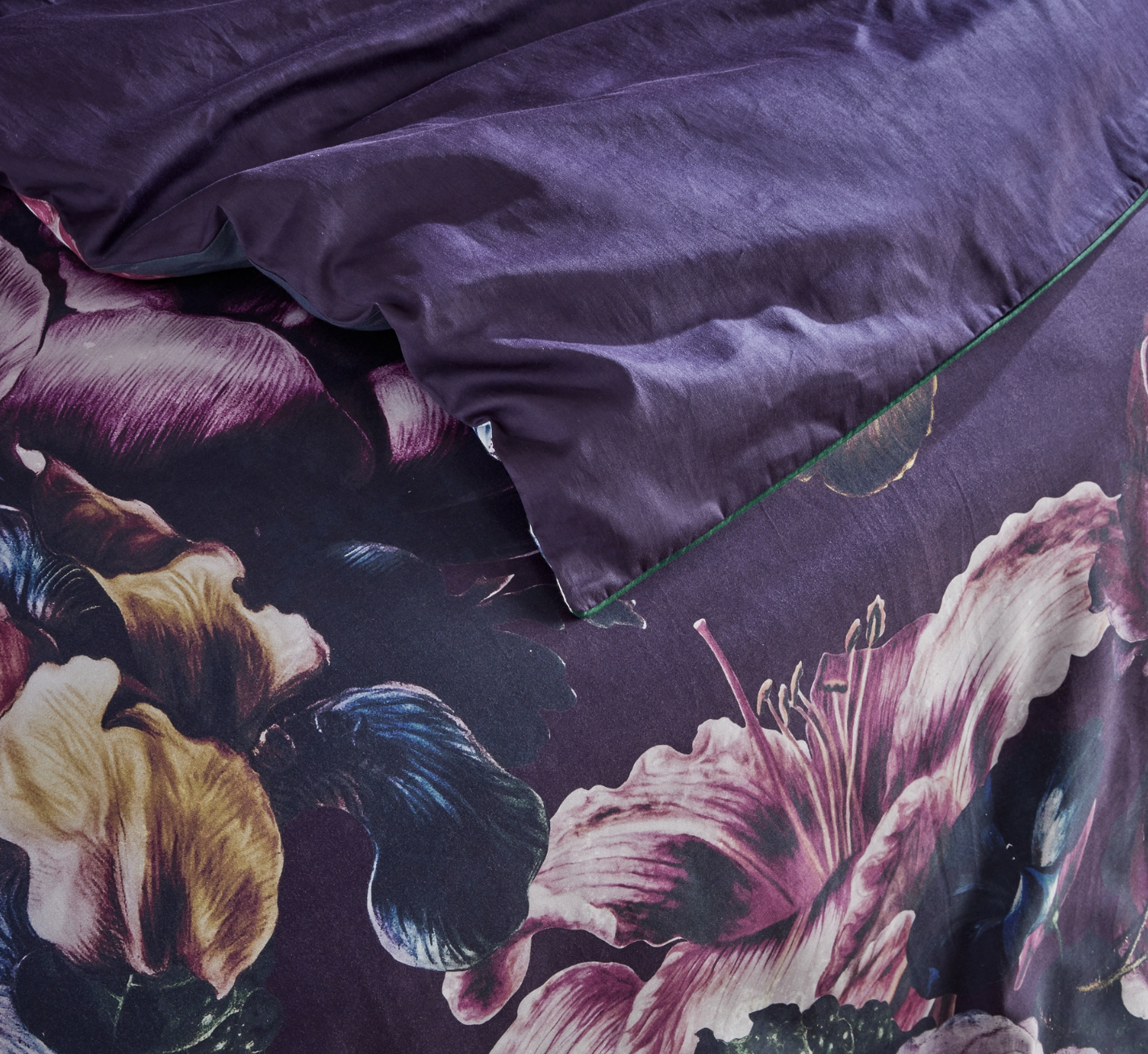 pireerd op de romantische bloemen van de Hollandse meesters. Een tijdloze klassieker vol duistere charme en pracht, uitgevoerd in een modern botanisch dessin met diepe, sfeervolle kleuren. De keerzijde is effen en ton-sur-ton, perfect passend bij de print.