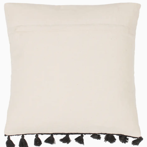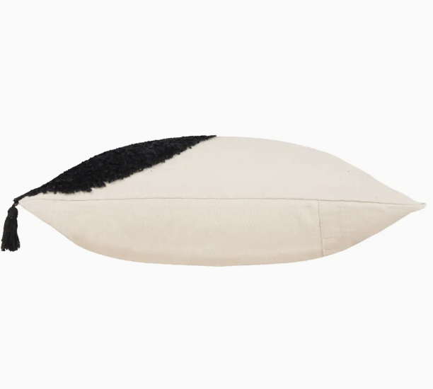 Een kussen van twee helften, deels gewoon geweven, de andere helft ongelooflijk zacht getuft katoen in de vorm van een halve cirkel. Afgewerkt met een zachte, zwarte rand met kwastjes aan de ene rand, naast een standaard mesrand en een verborgen ritssluiting op de effen achterkant. Deze serie is verkrijgbaar in een reeks aardetinten die luxe, stijl en verfijning aan uw woninginrichting geven
