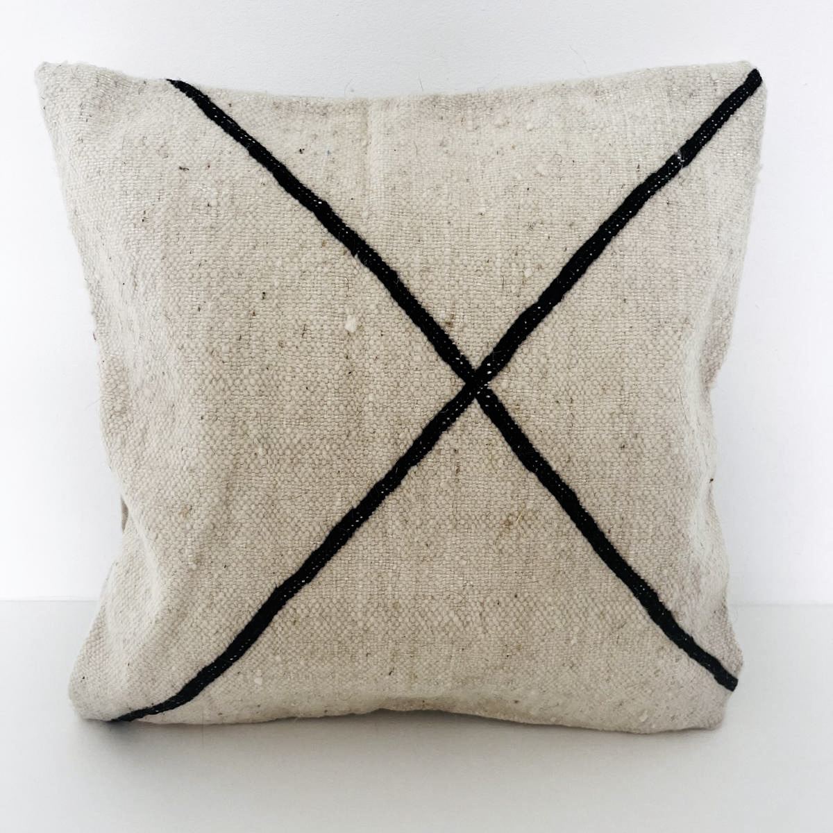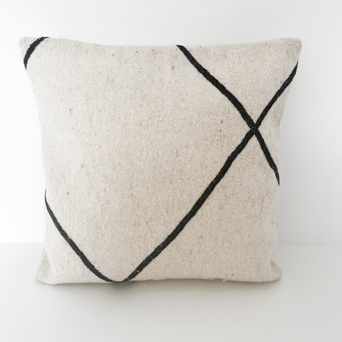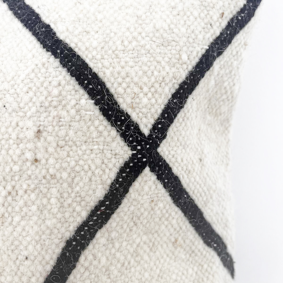 Breng een vleugje Marokko in huis met deze handgemaakte kelim kussens. Geïnspireerd op het traditionele Beni Ouarain-tapijt uit het Berberdorp in het Mid-Atlasgebergte, stralen ze de geometrische schoonheid en vakmanschap van de Berbers uit. Perfect voor wie houdt van grafische patronen zonder felle kleuren.