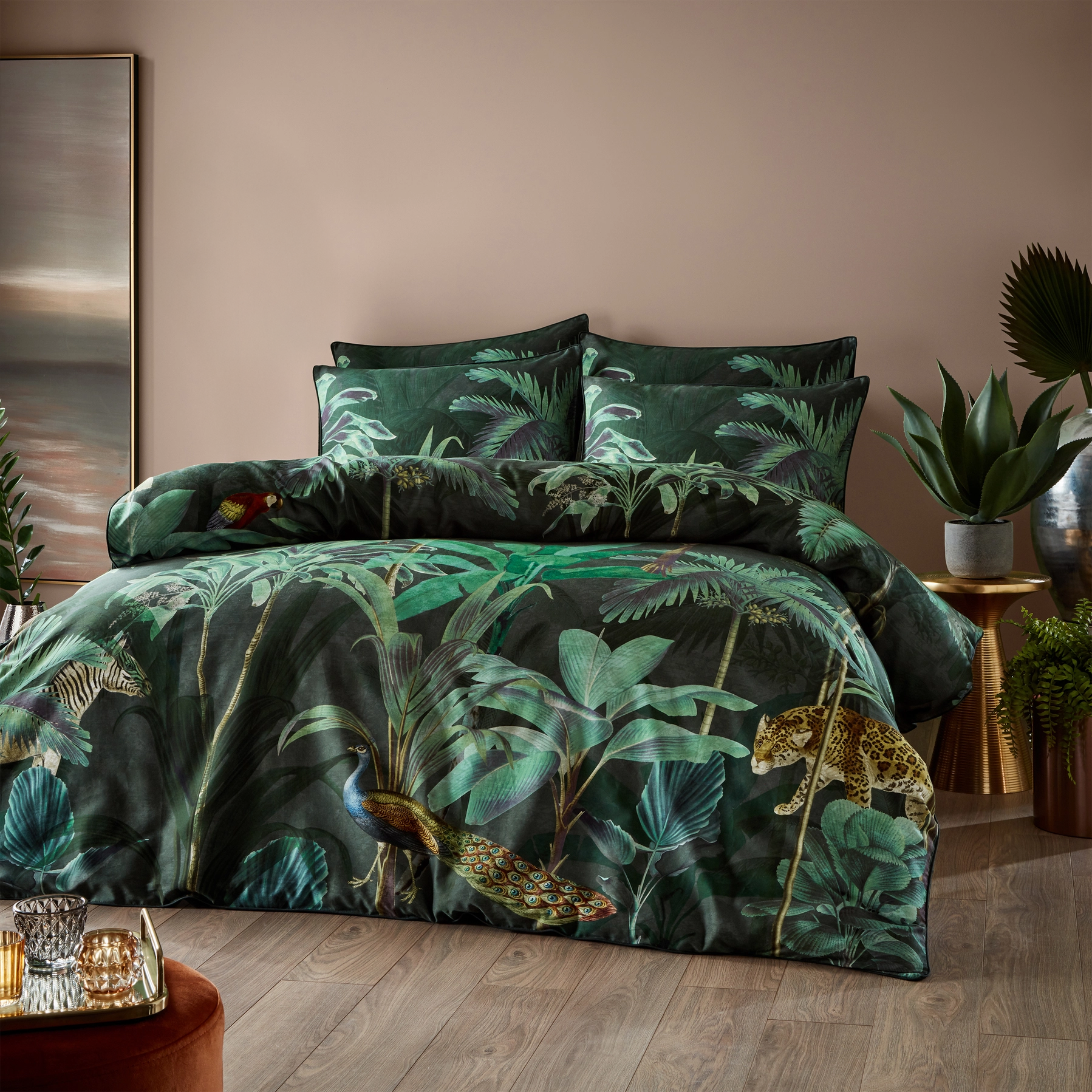 Ga op avontuur met deze dekbedovertrekset vol uitbundige wilde dieren en vogels tussen weelderige groenblauwe bladeren. Hun gezang en het ruisen van de flora brengen de print tot leven, tegen een nachtgroen landschap dat de magie van de scène versterkt. De keerzijde is effen en ton-sur-ton, perfect passend bij de print.