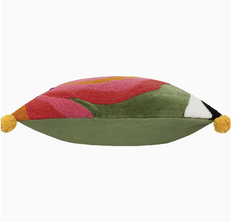 Het Poppy-kussen is voorzien van een levendig gekleurde abstracte geborduurde bloem, geplaatst op een pluche groene fluwelen achtergrond. Dit ontwerp, compleet met een effen katoenen achterkant en een pomponrand in contrasterende kleur, zal in elk huis een statement maken.